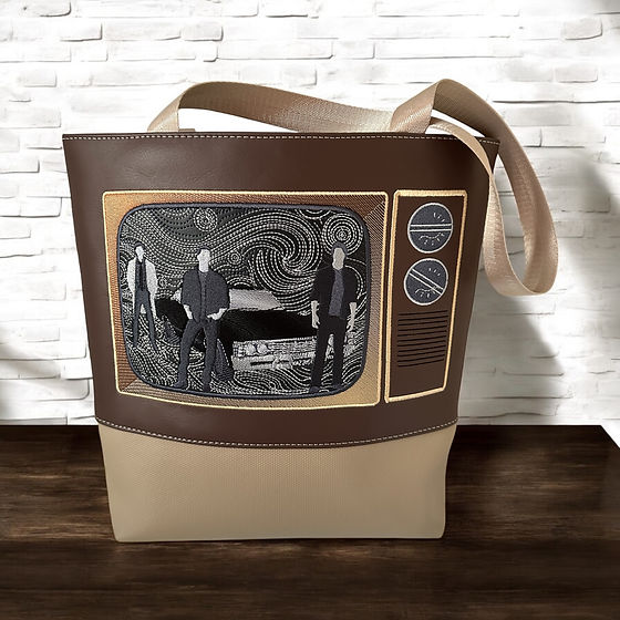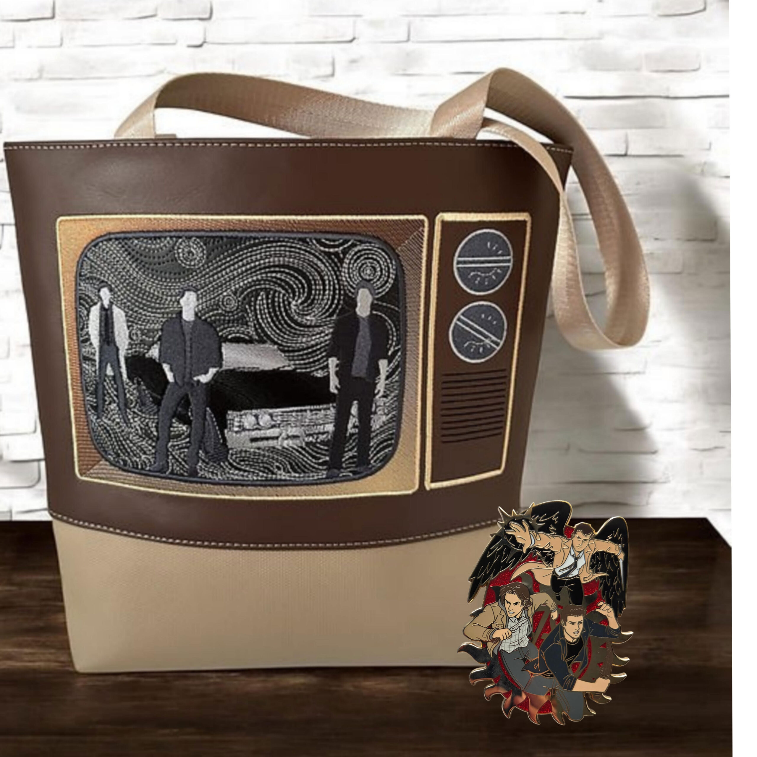 ITEM 1: handmadethreadstudio.com/product-page/spn-vintage-tv-tote-bag SPN vintage TV Tote Bag, approx size 13 x 13″. Exterior: Faux leather. Interior: Water-resistant canvas. Handles measure approx 25″ end-to-end. Back of the bag is plain brown faux leather.