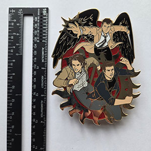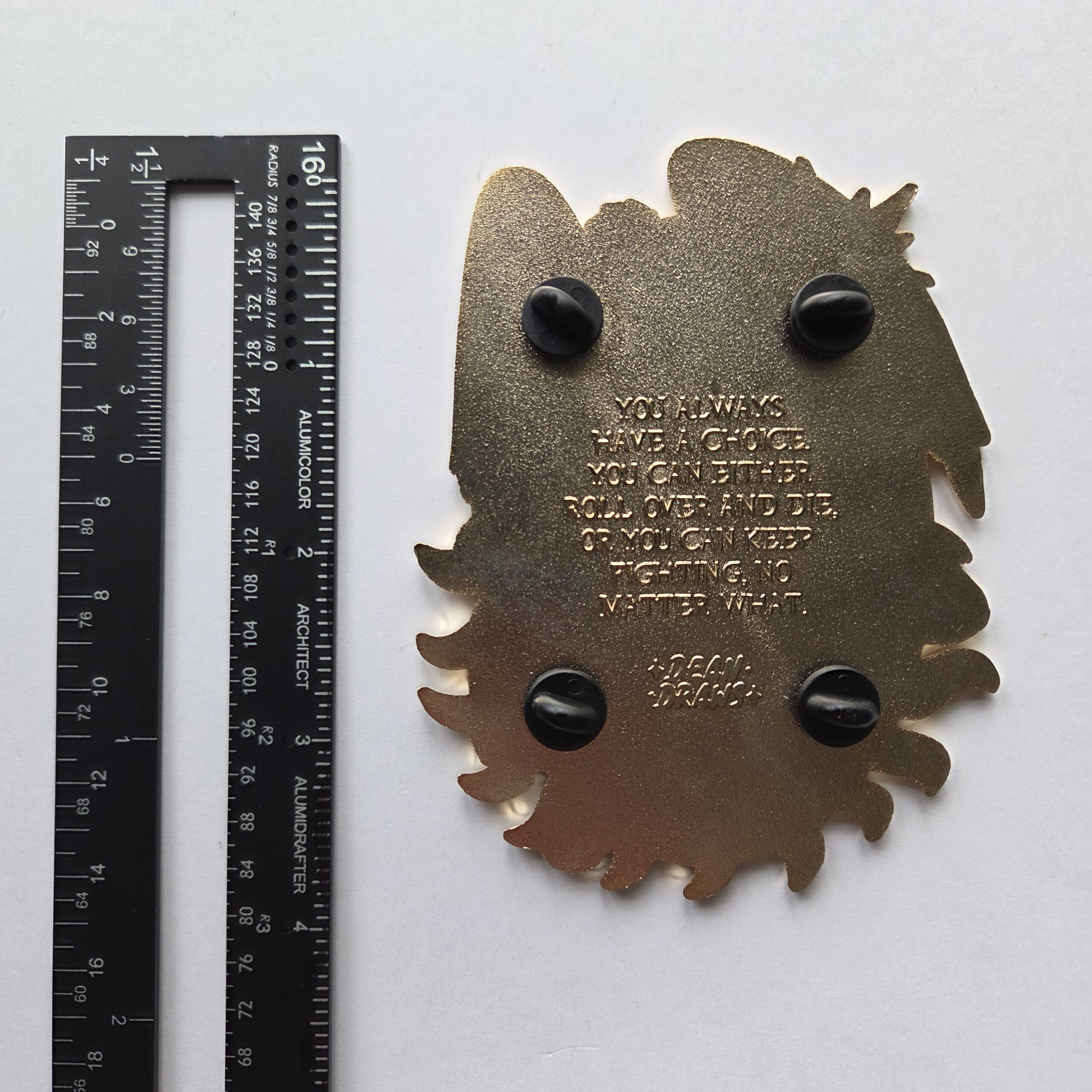 ITEM 2: DISCONTINUED, incredible jumbo Team Freewill pin by @deandrawsart. See pictures for measurement. The back reads “You always have a choice. You can either roll over and die, or you can keep fighting, no matter what.”